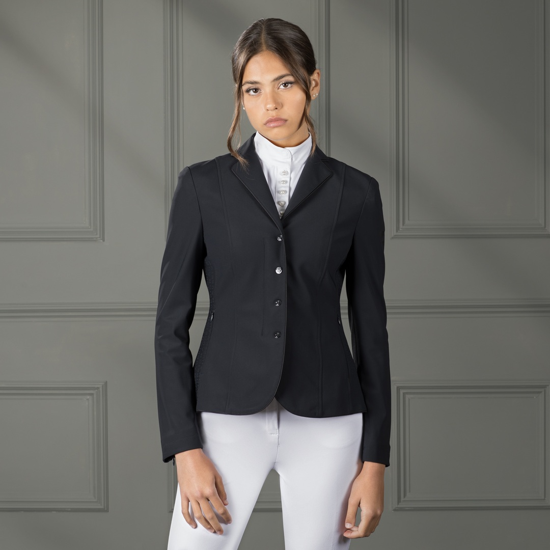 The Shires Aubrion Ladies Stafford Show Jacket has a modern saddle-skimming length and a slim contour shape. Satin is piped around the jacket edge for definition, cuffs are zipped for an immaculate silhouette. Multiway flex-fit fabric and unlined sleeves give the competitive rider total freedom and a sleek look. Perforated side and under arm panels look stylish and offer targeted ventilation, fabric is quick drying and breathable.