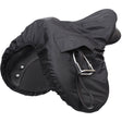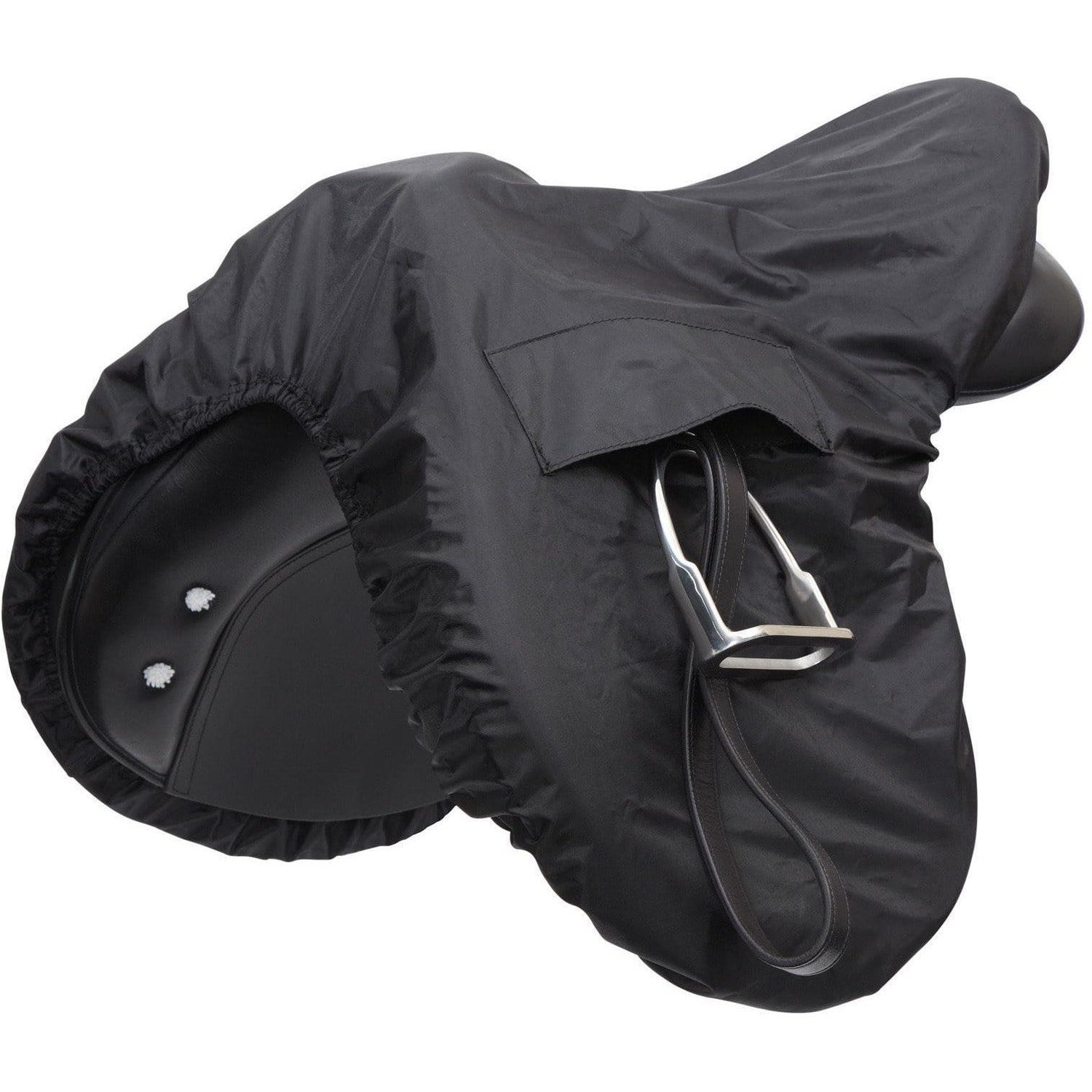Keep expensive saddles protected from the rain while in use and avoids dyes leaching into jodhpurs and breeches. The elastic edging stretches over the seat and saddle flaps of the saddle and reinforced stirrup holes allow leathers to be attached over the top of the cover. Comfortably fits all sizes of General Purpose and Close Contact saddles. PU coated polyester. Machine wash cool with non detergent soap.