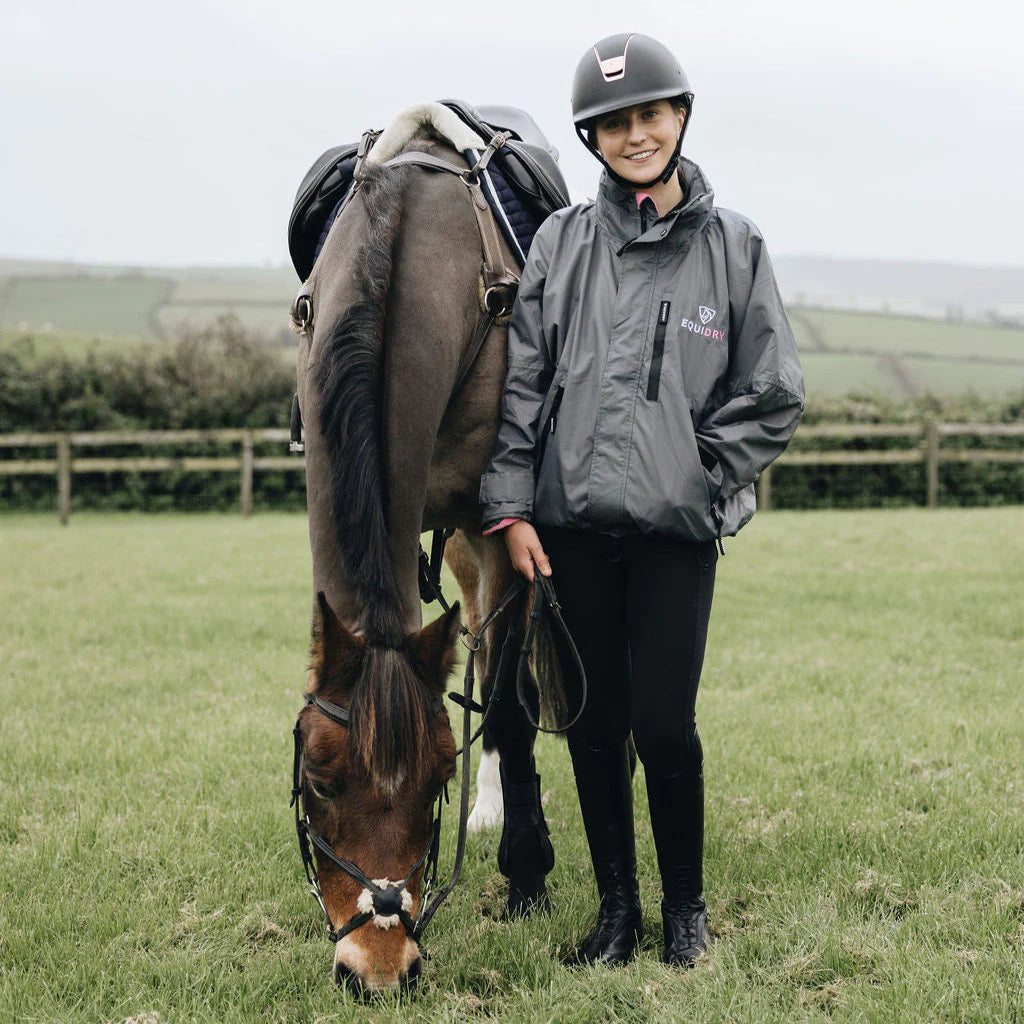 Practicality is at the forefront with a waterproof chest pocket for secure storage, a bungee adjustable hem for flexible wear, and deep fleece-lined pockets – including two large external zip pockets and two handwarmer pockets with storm guards – to keep moisture out and belongings safe. Available with either a fleece or cool mesh lining, the Shortie combines function and comfort with matching accessories for person, pony, and pup.