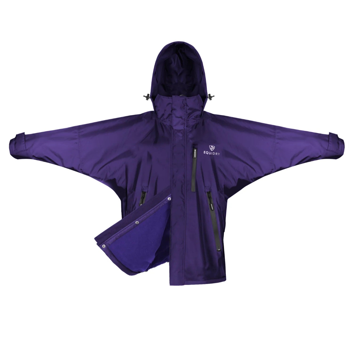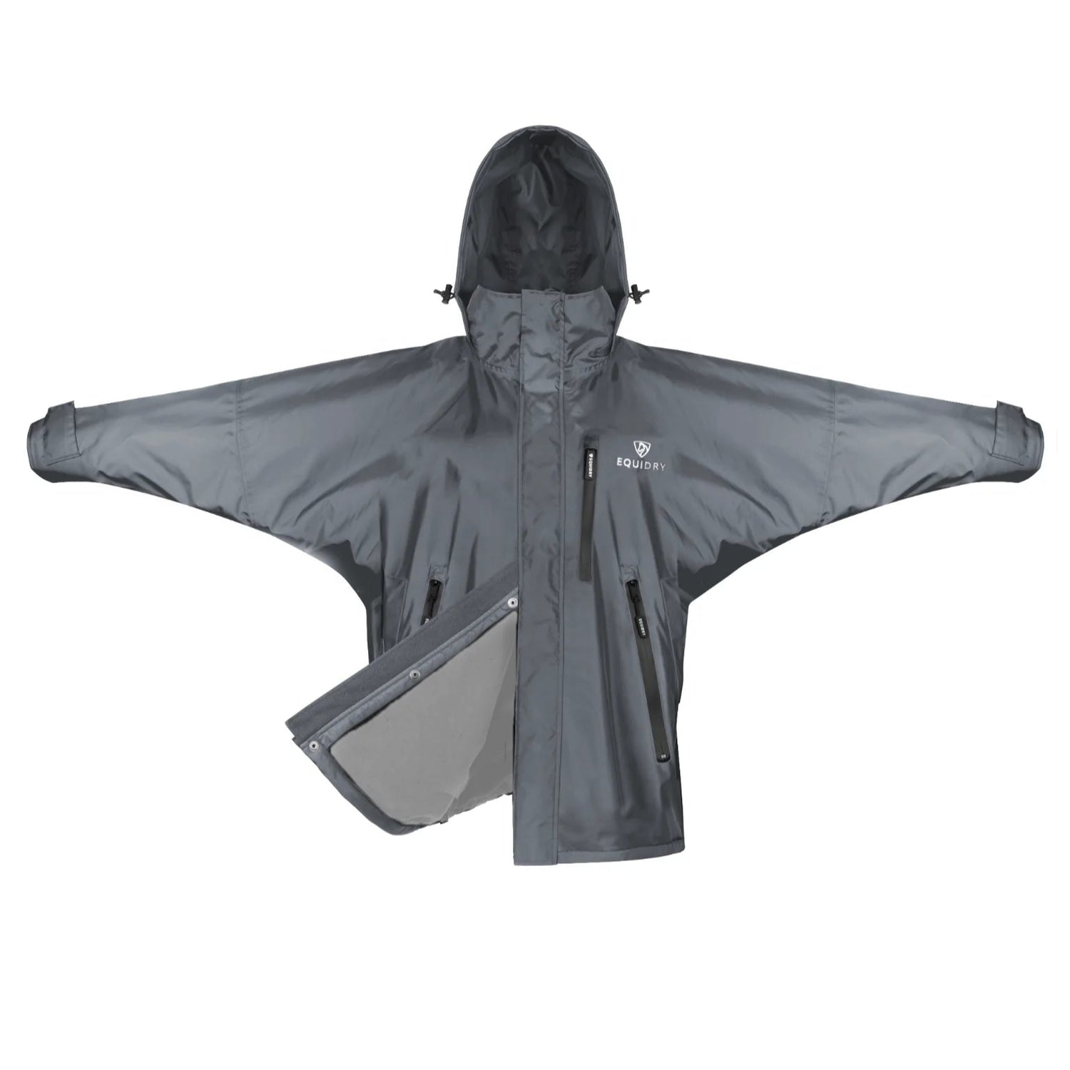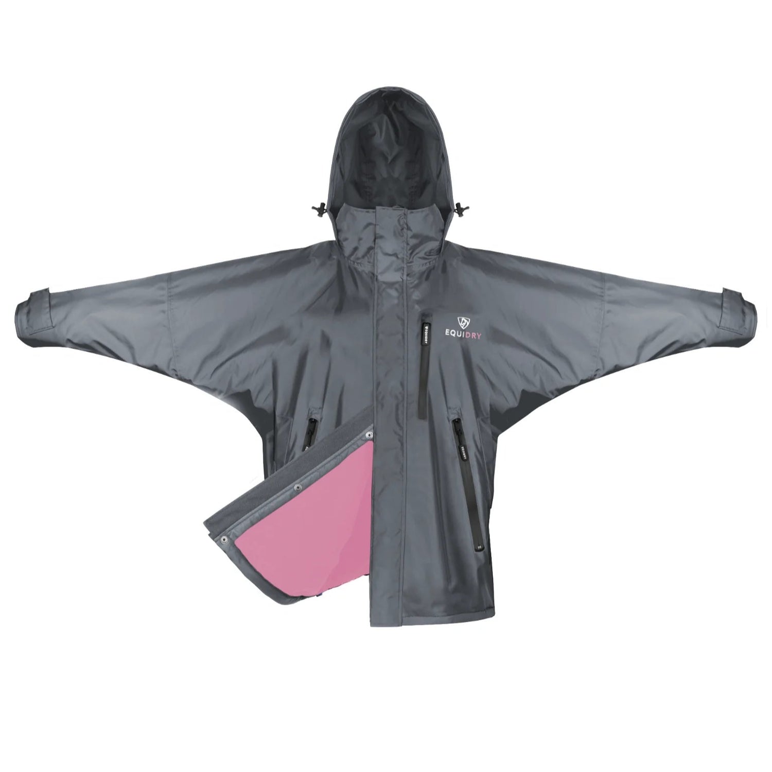 The oversized unisex fit ensures freedom of movement and room for extra layers or a body protector, while the adjustable stowaway hood, fitted with bungee toggles and a Velcro strip, provides a customisable fit over most riding hats or a more conventional look when required, neatly tucking into the collar when not in use.