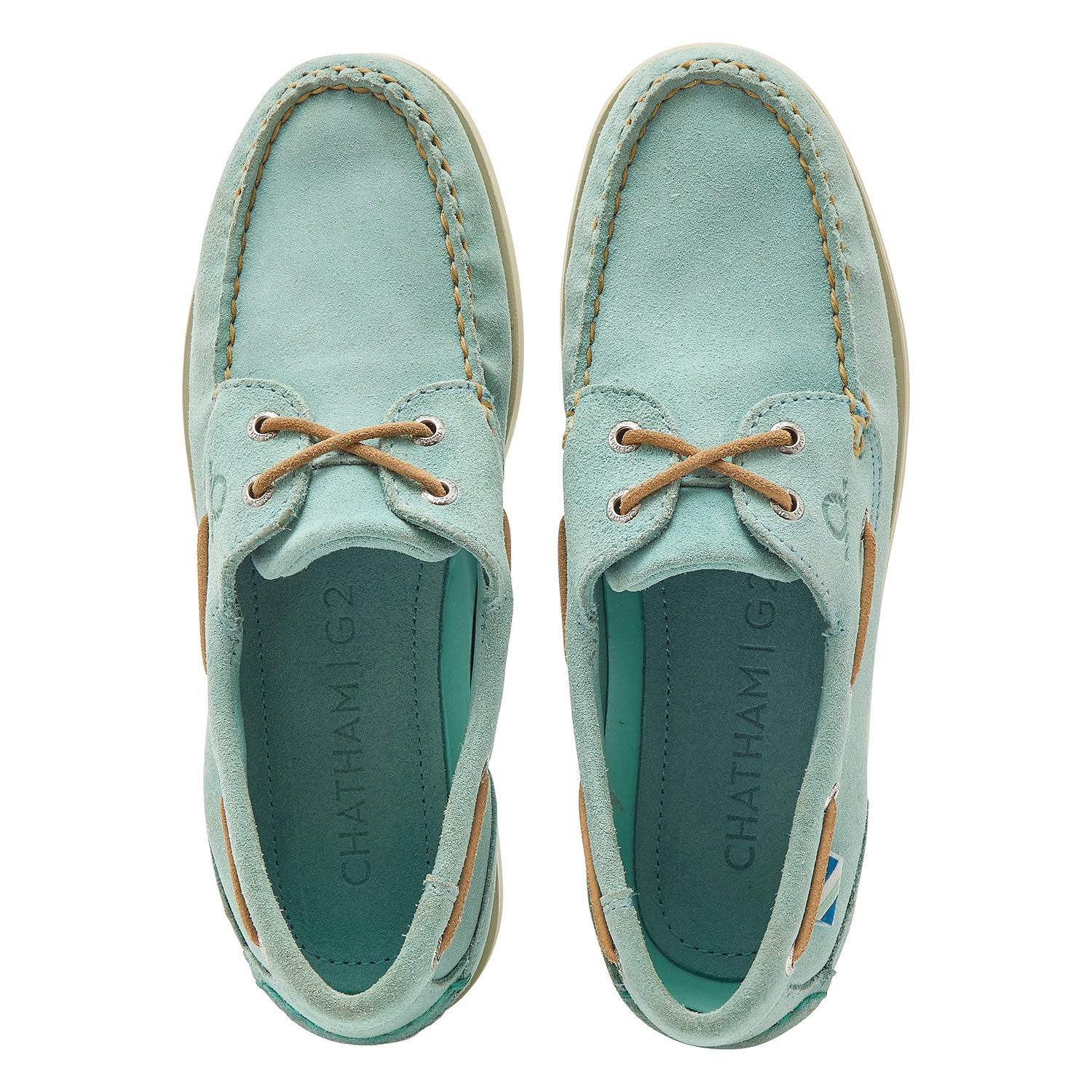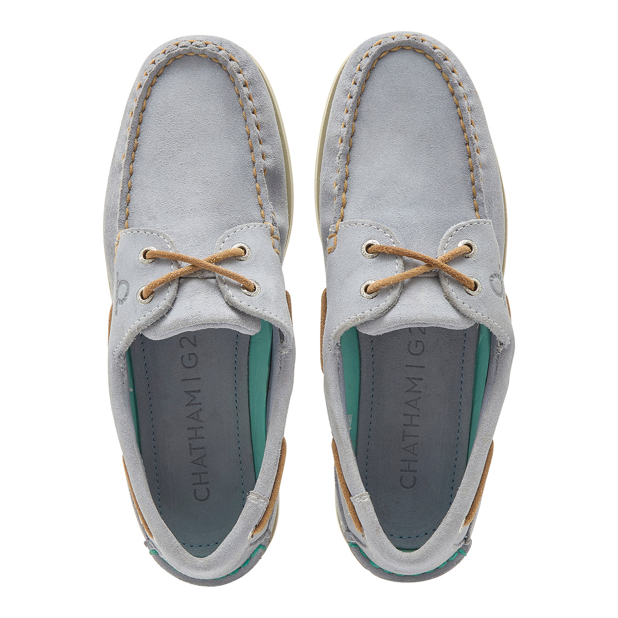 Beautifully-made from premium, super-soft calf suede by CF Steads UK in pale jade, they are water resistant and resin-backed for colour fastness. These two-eyelet deck shoes are moccasin-constructed for an optimal fit, are hand stitched on the last, have tan leather lacing, and are finished with a cream latex rubber sole for enhanced grip.