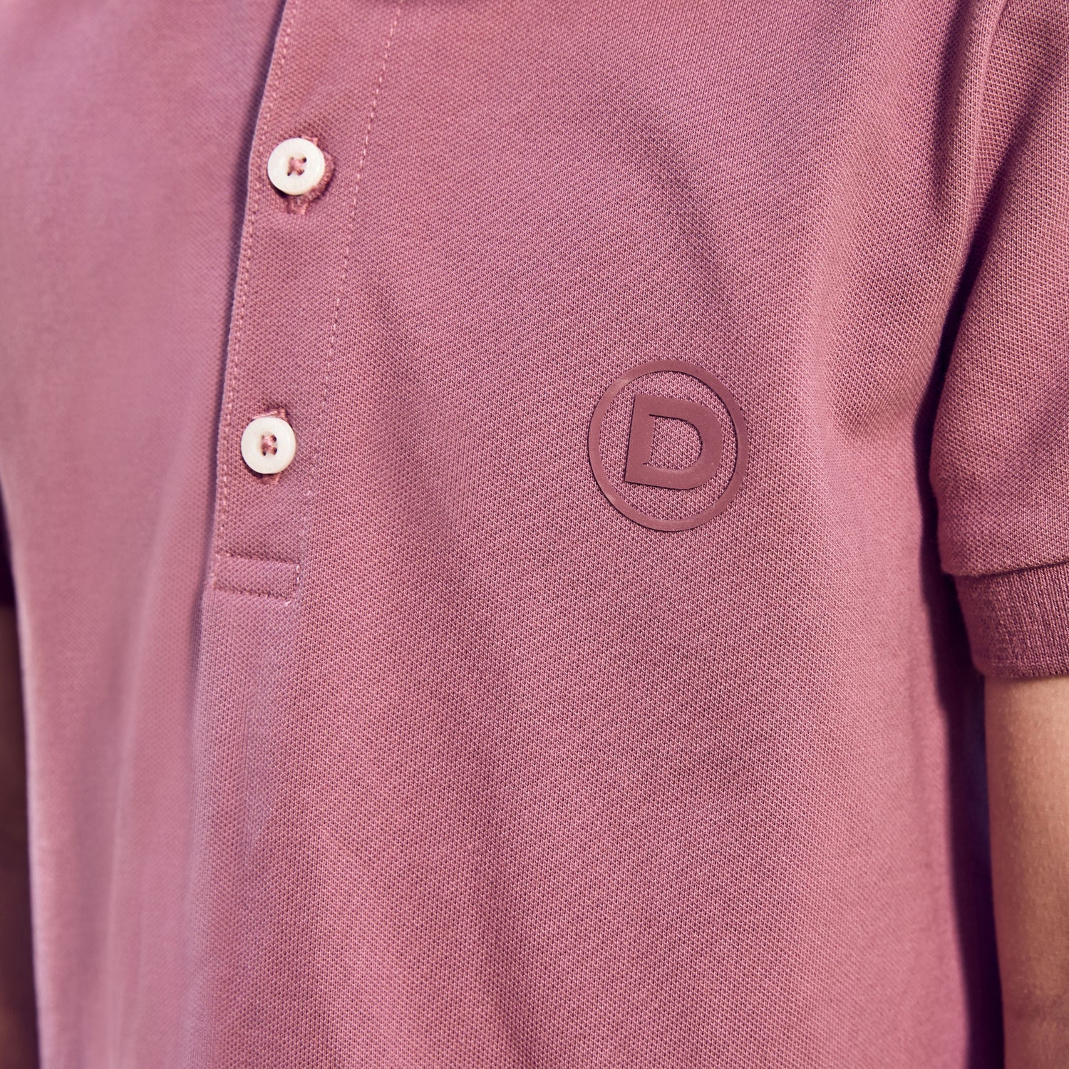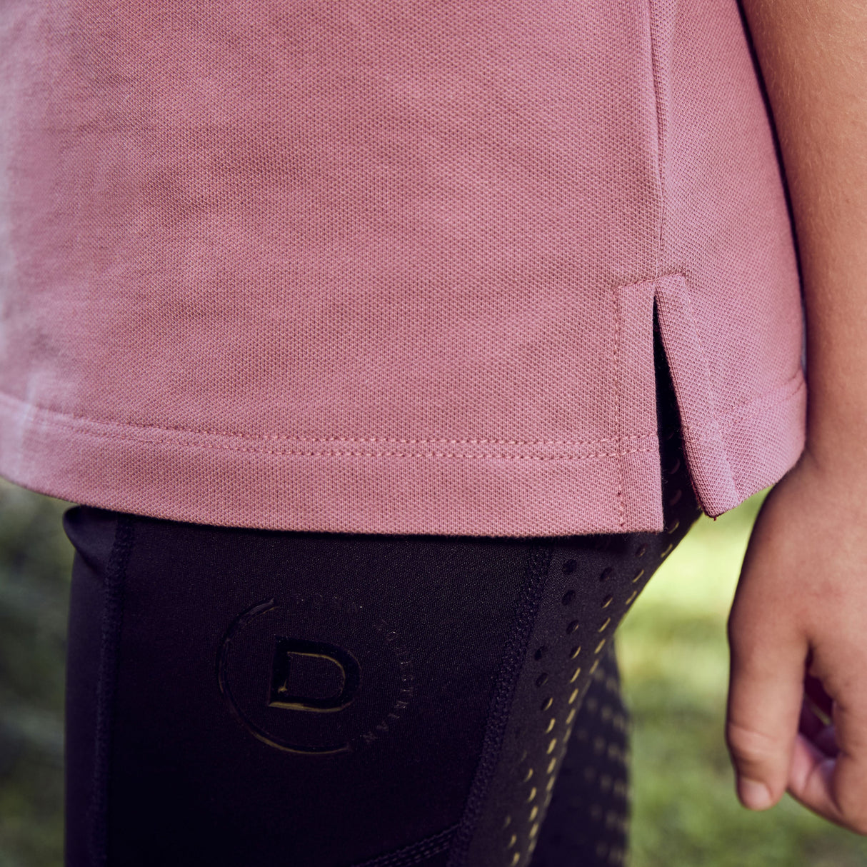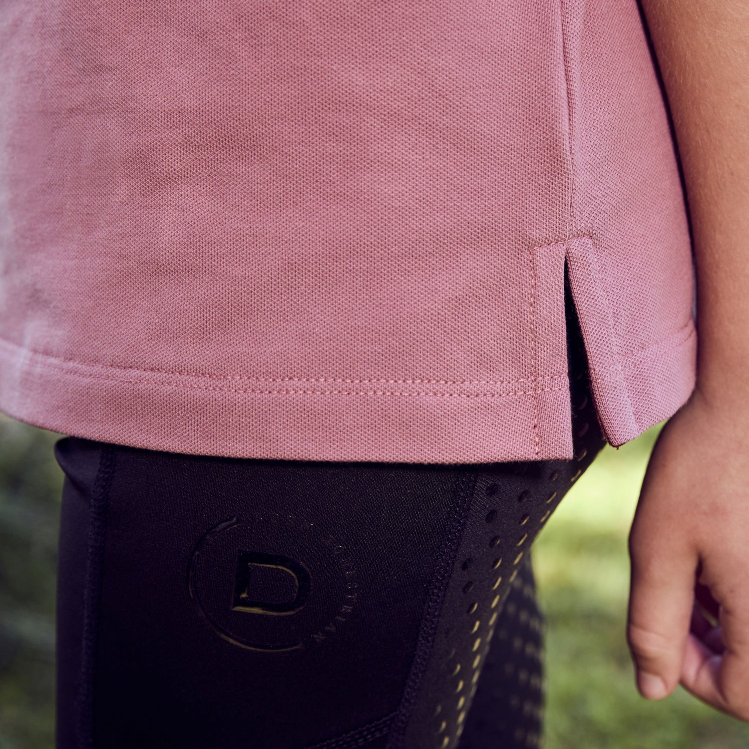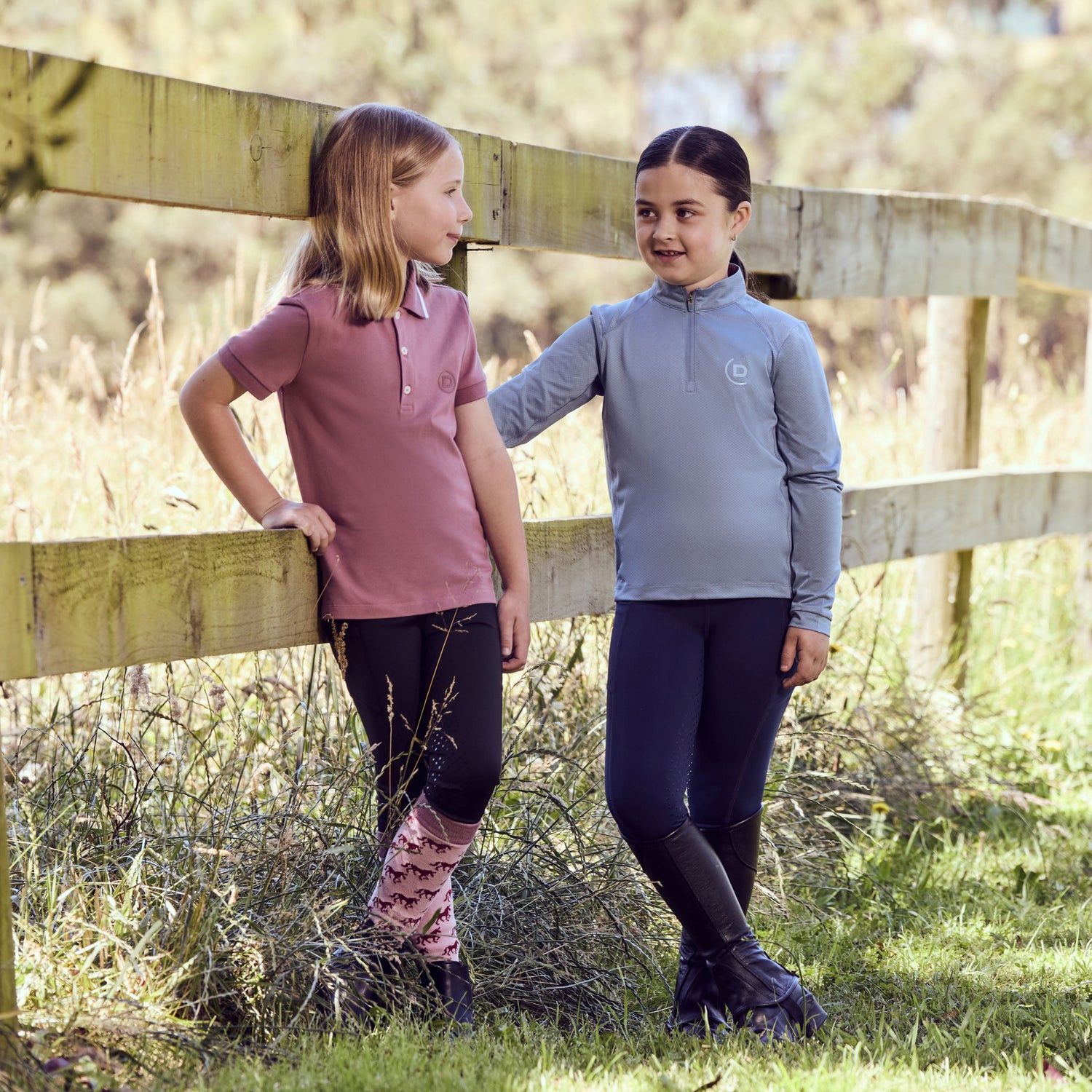 Stay cool while riding in style in the Dublin Kids Cotton Pique Short Sleeve Polo. This classic stretch cotton polo is naturally breathable, allowing moisture to be drawn away from the body keeping you cool and comfortable all day long. The flat knit jacquard rib collar can be worn up or down for style as well as protecting your neck on sunny days. Fitted short sleeves offer a sleek fit and paired with the ribbed cuffs and button placket complete the sporty look. Subtle self-coloured Dublin 'D' branding on the front left chest keeps this polo smart and simple.