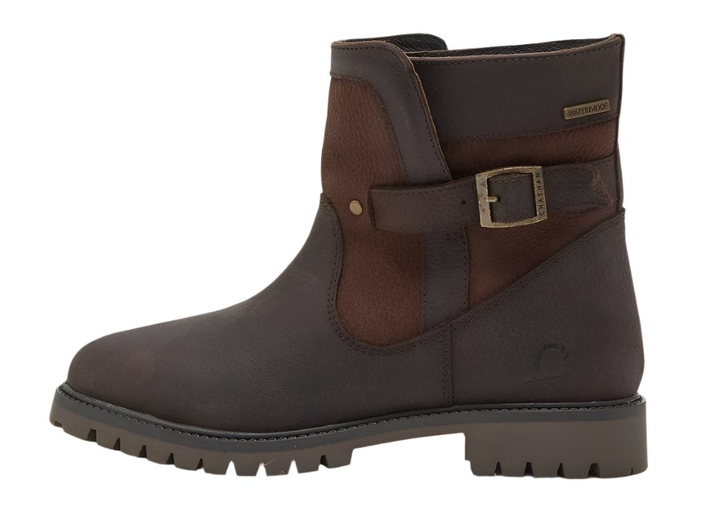 Made using a stylish blend of waterproof premium leather in smooth and grained finishes in rich dark brown, these women's ankle boots are a pull-on style with buckle detail, Chatham logo and a 100% waterproof breathable fabric lining. They have the Chatham sole spring poron performance cushioning, which is anti-bacterial and offers maximum comfort and shock absorption, and they sit on a heavy duty rubber sole.