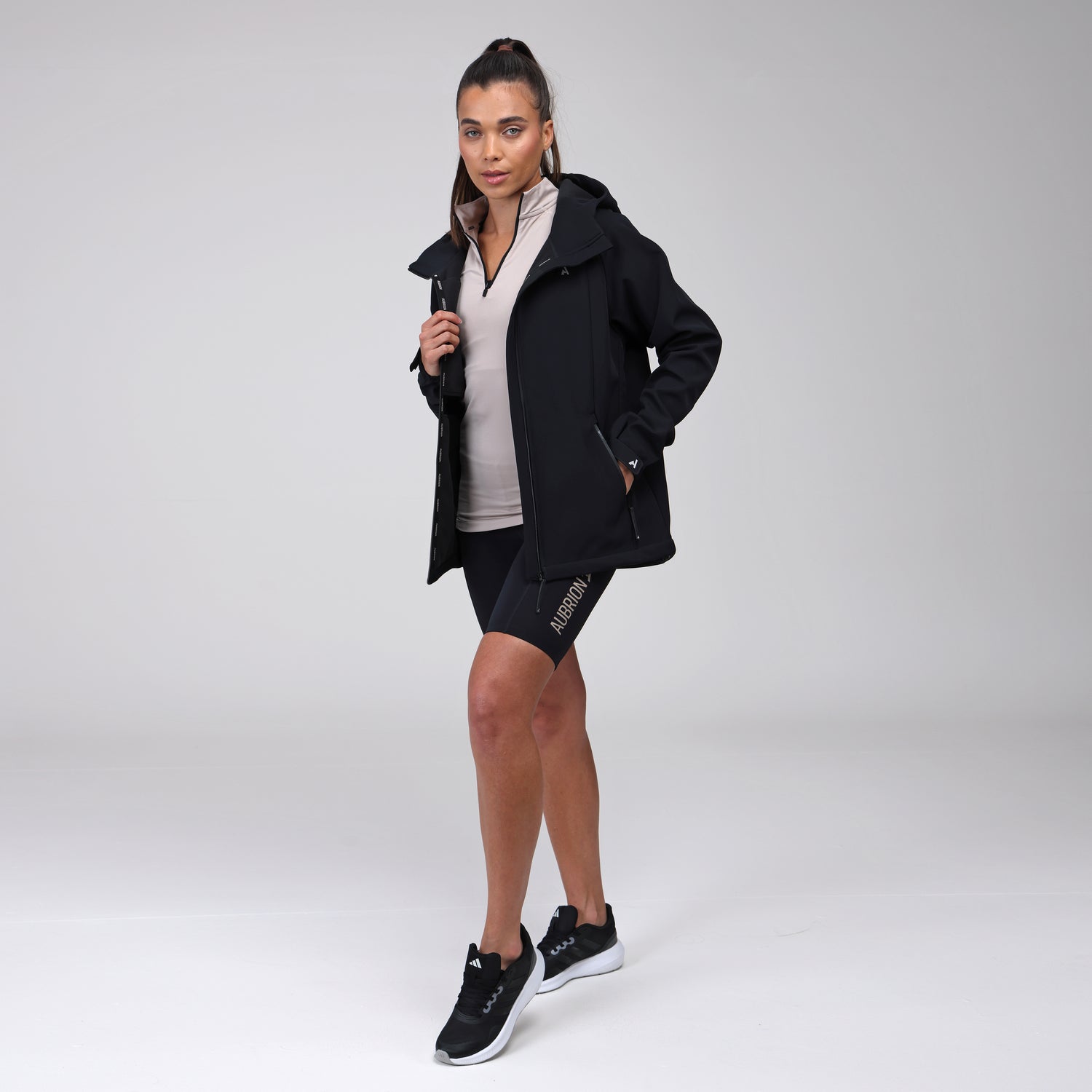 The fleecy inner offers moisture management technology to keep the body comfortable; the full-length zip allows increased ventilation when required. Bungees at the lower hem and hood allow versatile fit adjustment. Three zip pockets add function. Bold Aubrion prints and signature trims finish the look. An oversized fit for ladies or true-to-size for the guys.