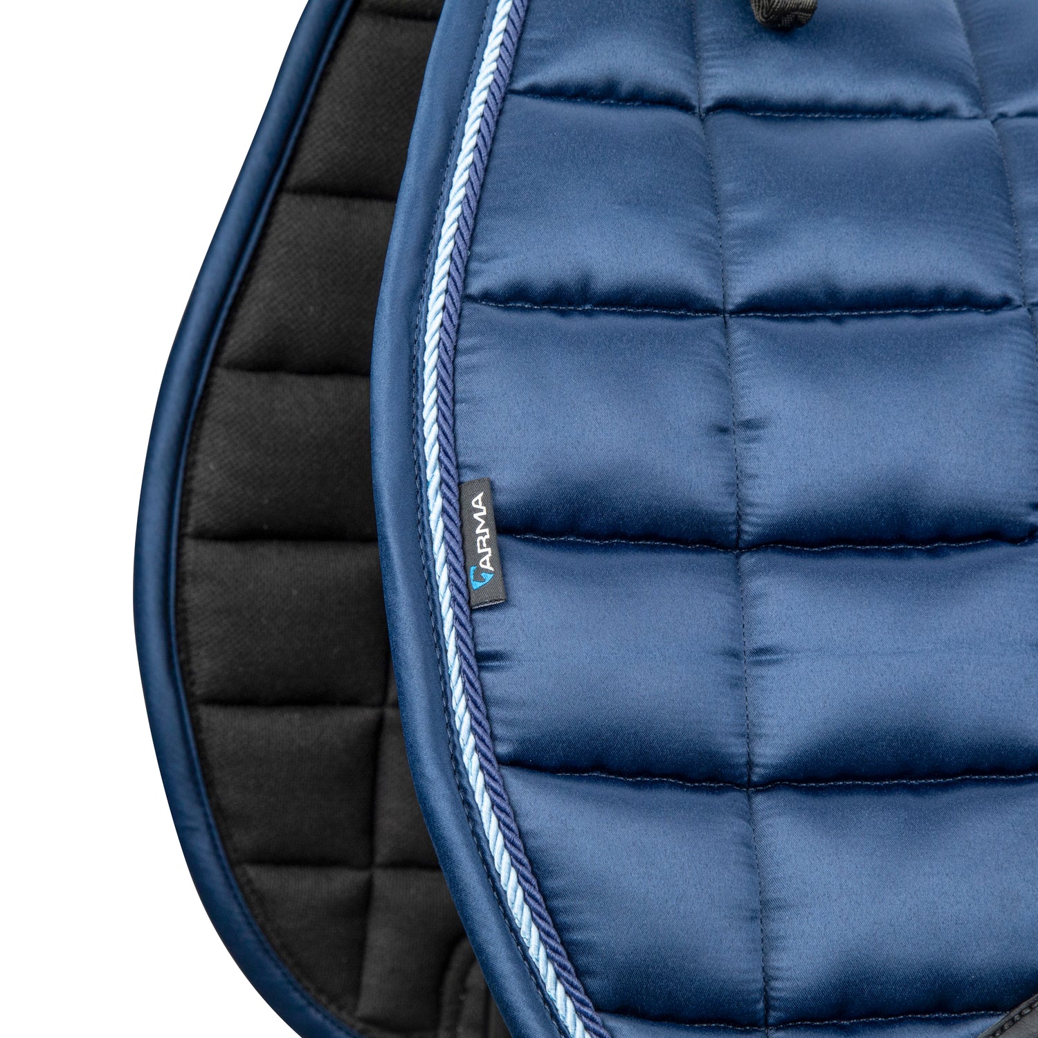 Ultra Dri Zone lining instantly wicks sweat from the horse to reduce the risk of rubbing and increase comfort. PU ARMA contour pro girth guard protects heavy wear areas. Jacquard logo tape looks smart at the spine, girth loops and elasticated D-ring straps. Finished with a metal logo badge. Machine washable. Coordinates with a range of ARMA horse and Aubrion rider pieces.