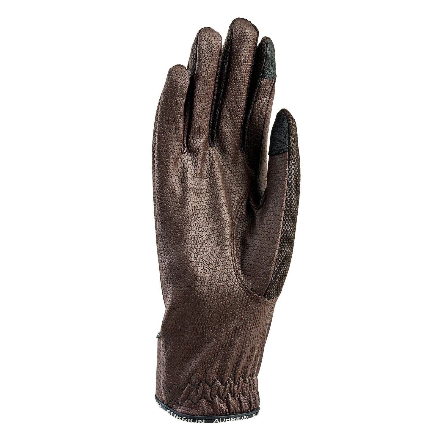 The Aubrion Aero FlexFit gloves keep a show-smart look to your warm weather riding. Open knit backs release heat and allow free flow of air to keep hands comfortable. Palm side, FlexFit fine synthetic leather features an attractive faux snake skin texture and offers a LiteGrip feel for greater rein contact.