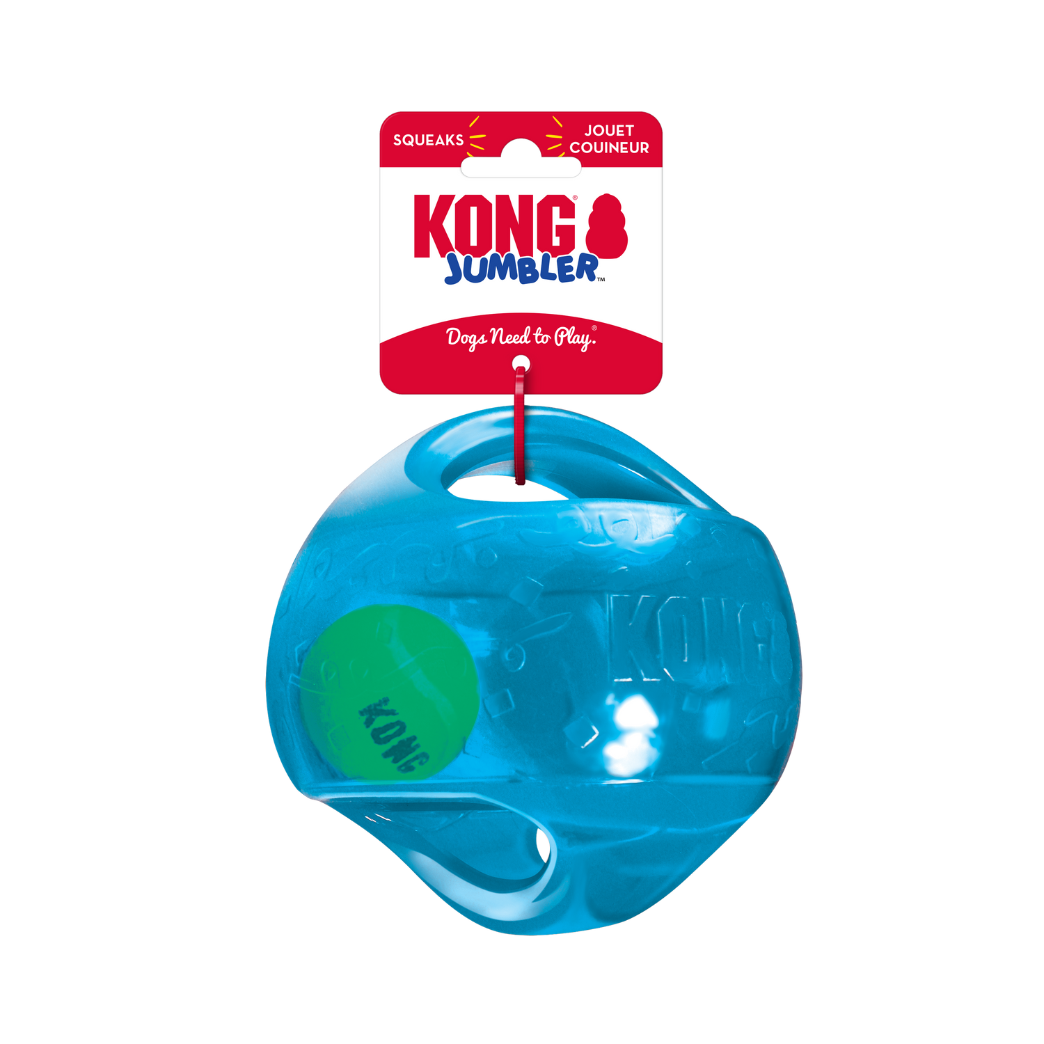 Der KONG Jumbler ist ein Zwei-in-Eins-Ballspielzeug für doppelten interaktiven Spaß. Der Tennisball im Inneren und das laute Quietschen laden zum Spielen ein, während die Griffe das Aufnehmen und Schütteln erleichtern. Der Jumbler hält hartem Spiel stand und ist daher ideal für Apportierspiele. Der KONG Jumbler ist in zwei Formen und Größen erhältlich und sorgt für eine aufregende, aktive Spielsitzung für Sie und Ihren Hund.
