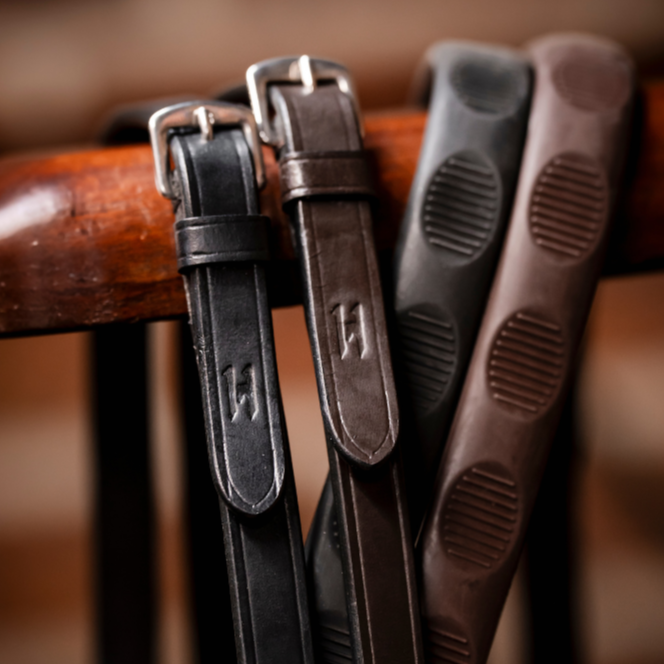 The Horseware® Thumb Grip Rubber Reins are designed to provide the ultimate hold and control. They feature textured indentations ideal for use in dressage to ensure even hand placement and contact, or for strong horses prone to pulling. A tear-resistant nylon core adds strength and durability. Includes tonal stitching, stainless steel hardware, and billet ends.