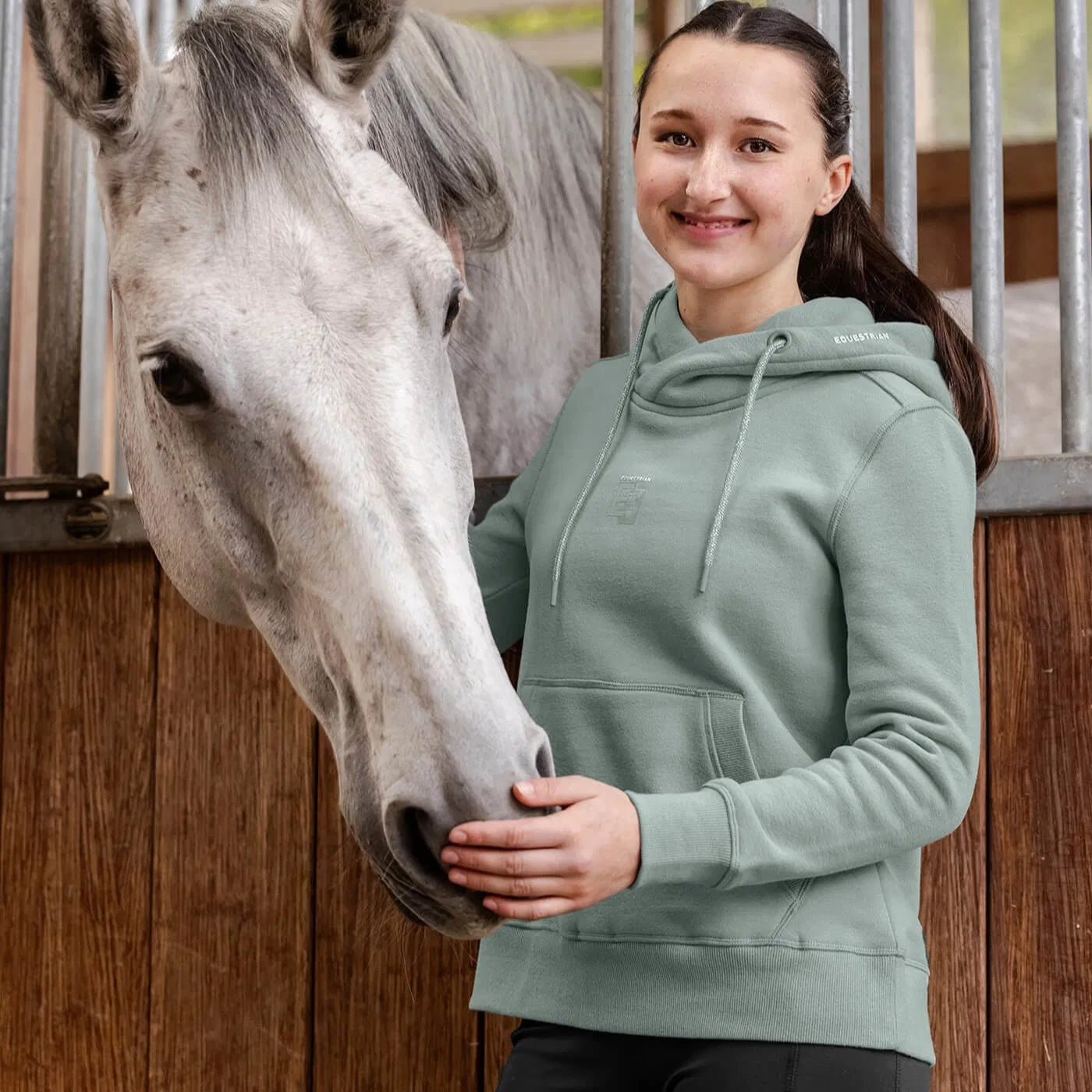 Experience ultimate comfort with the E.L.T Teens Hoody Ariana, designed for a relaxed, loose fit. Crafted from cozy, soft sweat material, it keeps you warm and comfortable all day. Featuring a hood with a drawstring and decorative cord, plus a large kangaroo pocket for convenience. The hood’s left side showcases embroidered equestrian lettering, while a raised logo print on the front adds a stylish touch. Perfect for teens who want both comfort and equestrian-inspired style.