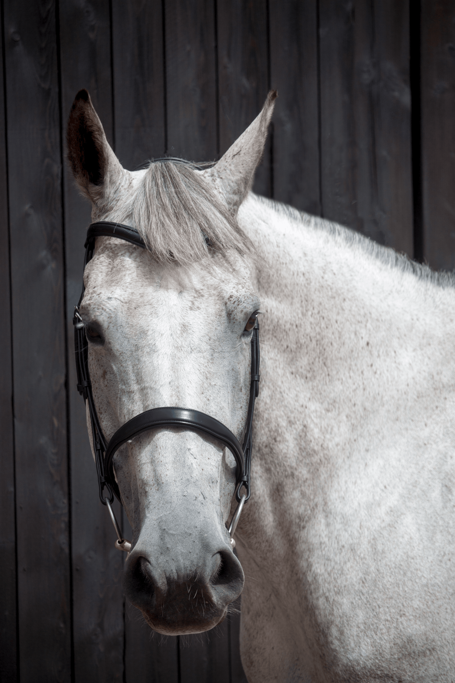 The throat lash strap has been strategically integrated into the headpiece to reduce the bulk in the sensitive TMJ area and allowing for the noseband and cheek piece buckles to lie flat against the horses skin.