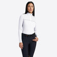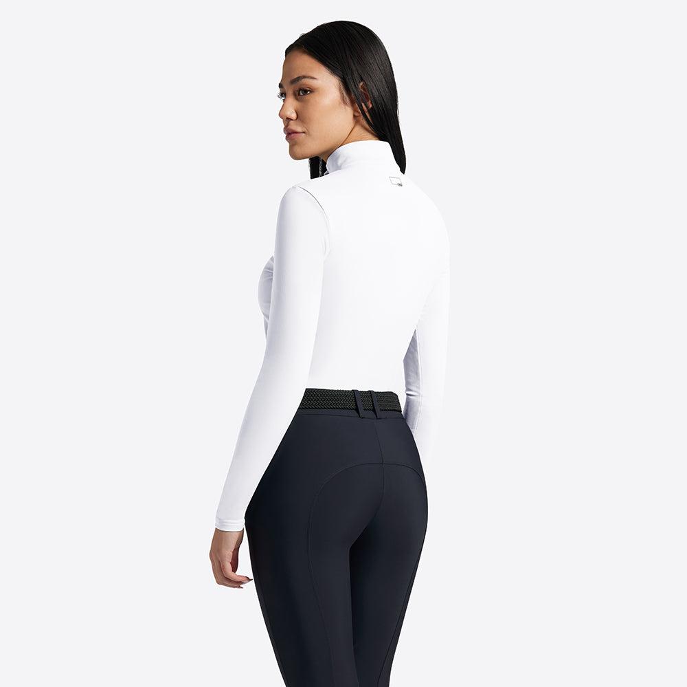 The design features a water-repellent matte zip with the puller mounted on a coated side for a secure and practical closure. The front print and back logo add a distinctive touch to the garment. Perfect for training with confidence and style, this polo is a must-have for any female rider who wants to stand out with a technical and modern look.