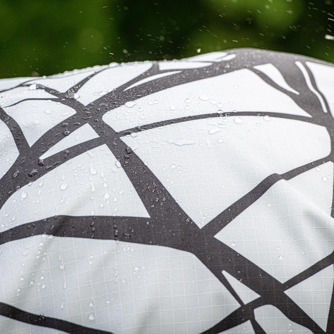 - L'imprimé unique s'inspire du motif de l'aile d'une mouche. Les lignes noires superposées sur fond gris créent une illusion d’optique dans l’œil d’une mouche.