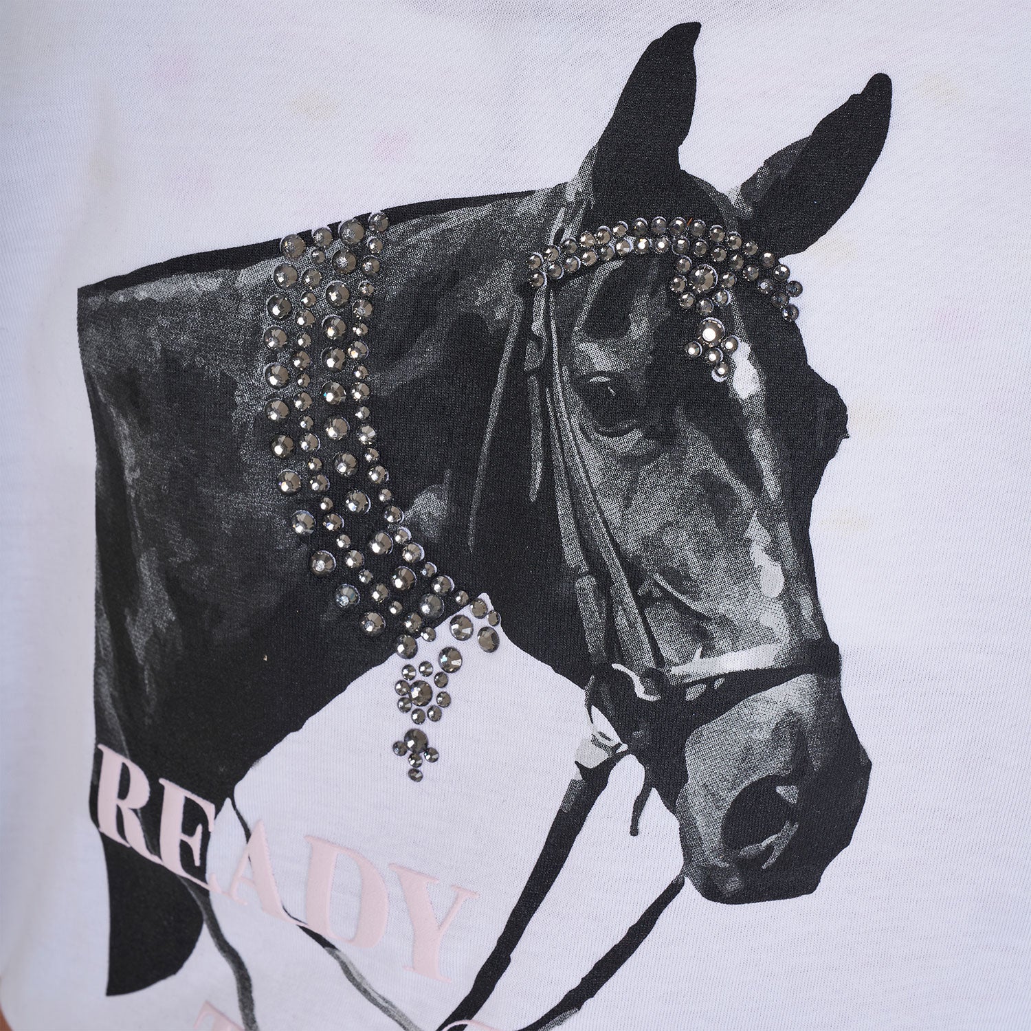 Girls' slim fit cotton T-shirt with print and rhinestones. Perfect combination of comfort and elegance thanks to its details. Girls' short-sleeved T-shirt with print and rhinestones made of soft cotton for a slim fit that delicately enhances the feminine silhouette. The design is characterized by the elegant print and the applied rhinestones, which capture the light giving bright reflections and unique shades. The print depicting the horse's muzzle in black and white, embellished with bright details, gives a touch of dynamism and elegance. Ideal for those looking for a combination of style and comfort, this T-shirt is perfect for completing casual-chic outfits.