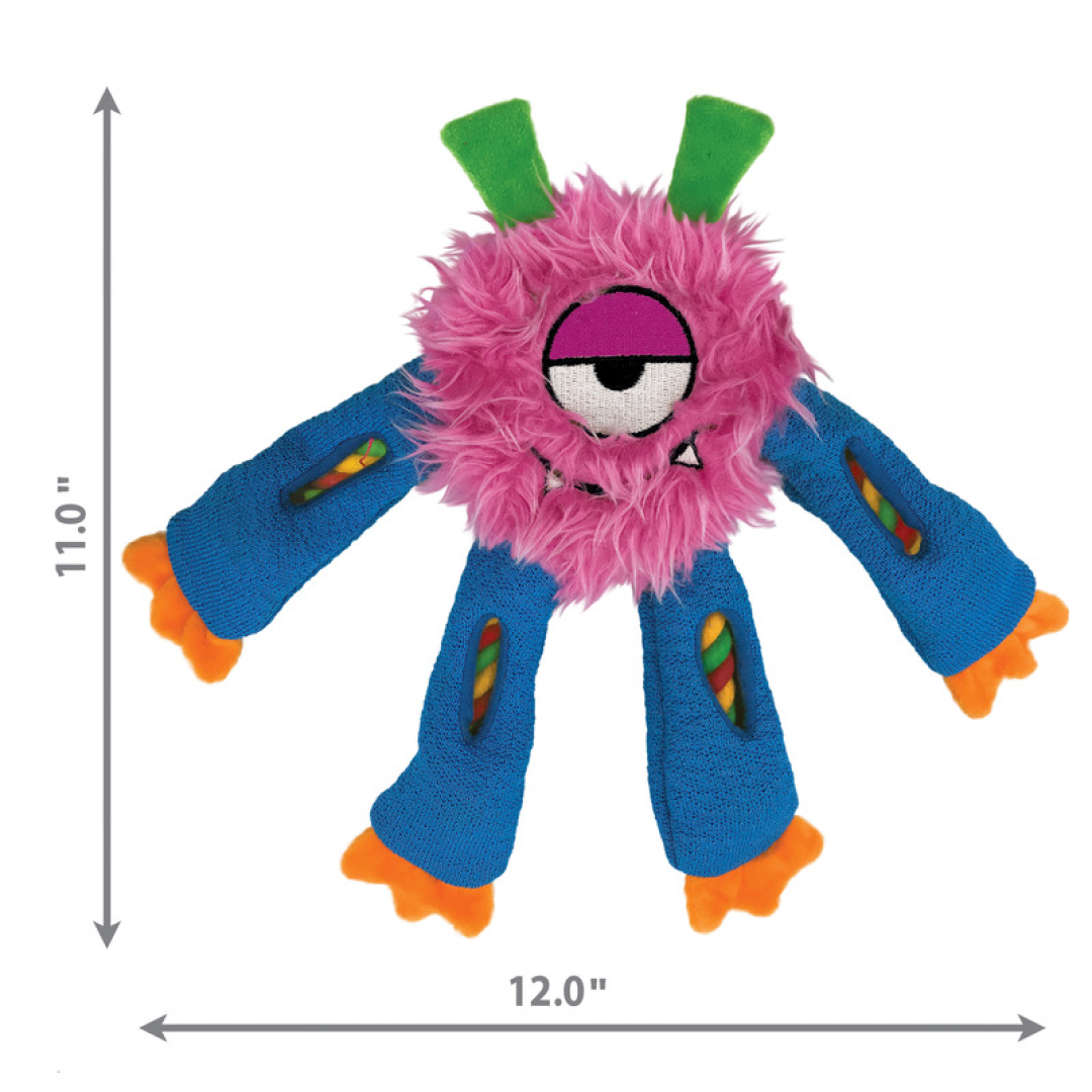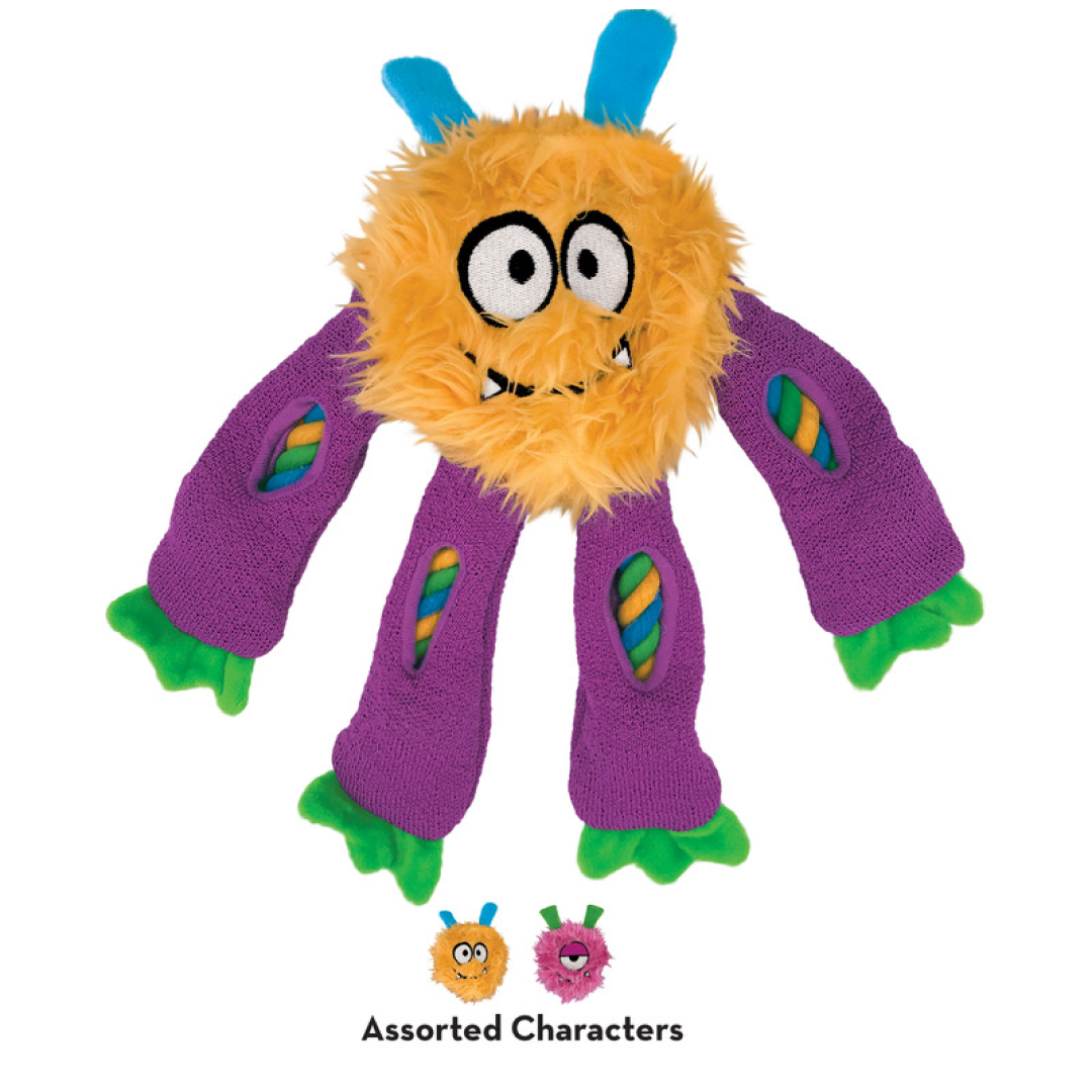 La corde interne robuste de Sneakerz Knots comporte un nœud de corde dans la tête qui s'étend à travers les jambes, offrant ainsi une sortie pour un comportement de mastication approprié. Des fenêtres uniques en forme de coucou piquent la curiosité et prolongent l'engagement en s'amusant à chercher de la nourriture. Les jambes longues et pendantes sont parfaites pour jouer en secouant et les jambes en matériau de chaussure de tennis adhérentes grincent pour des jeux de tiraillements interactifs à gogo avec ces copains souriants.