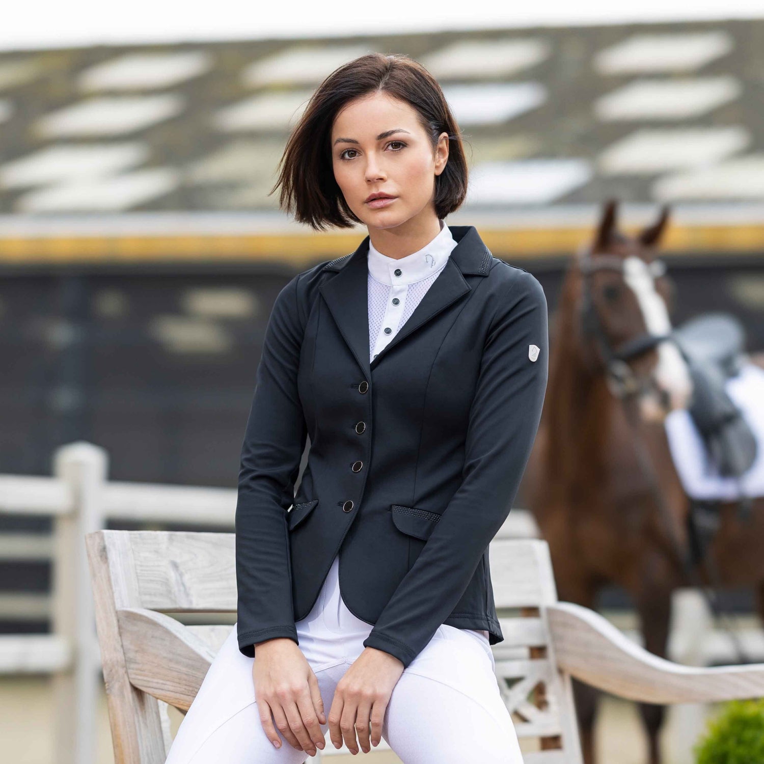 The HKM Ladies Competition Jacket -Amalfi- is the epitome of elegance and functionality. Made of crease-resistant material with a dirt-repellent surface, this jacket guarantees a flawless appearance. The concealed zip and rhinestone accents add a touch of sophistication, while riding slits and practical pockets provide maximum comfort.