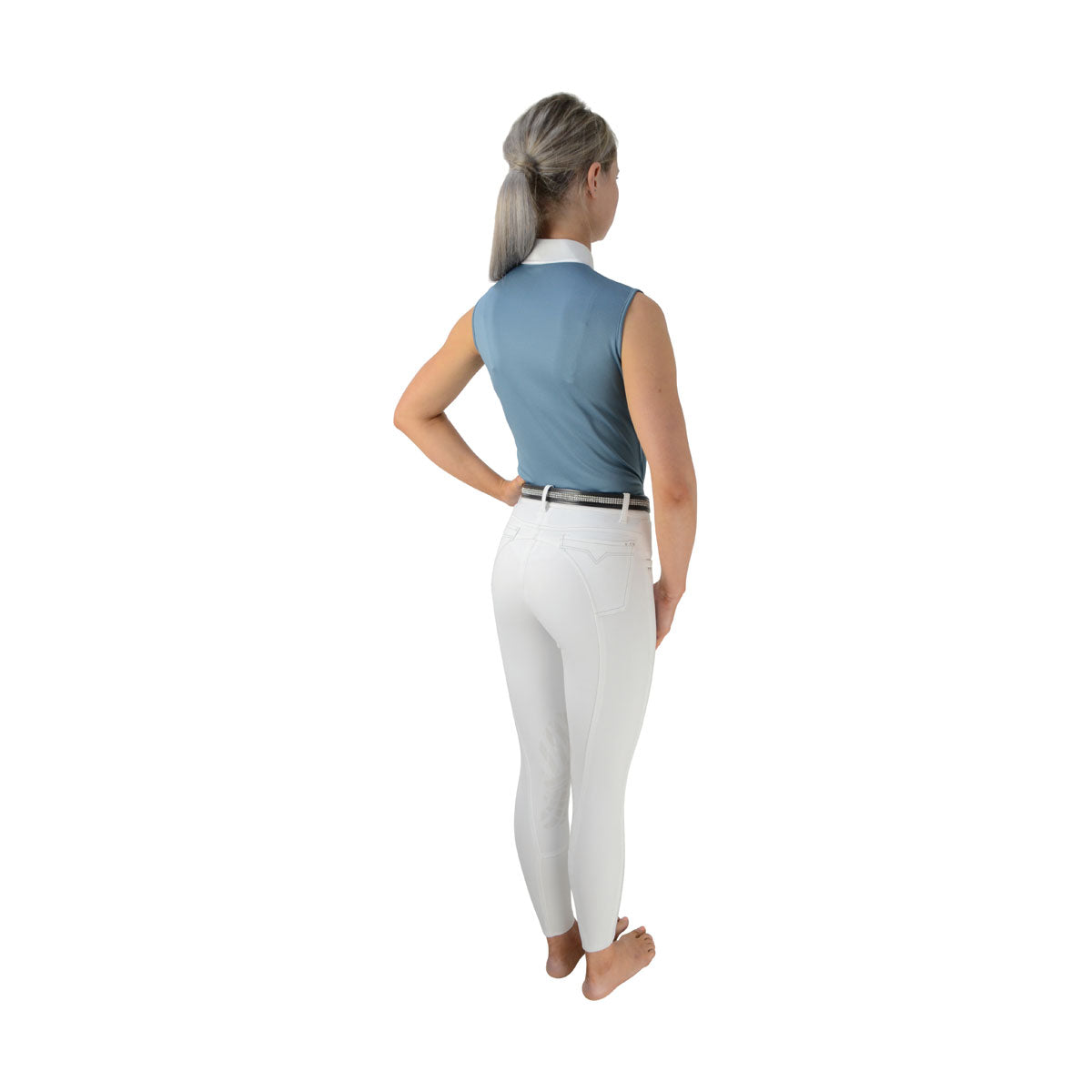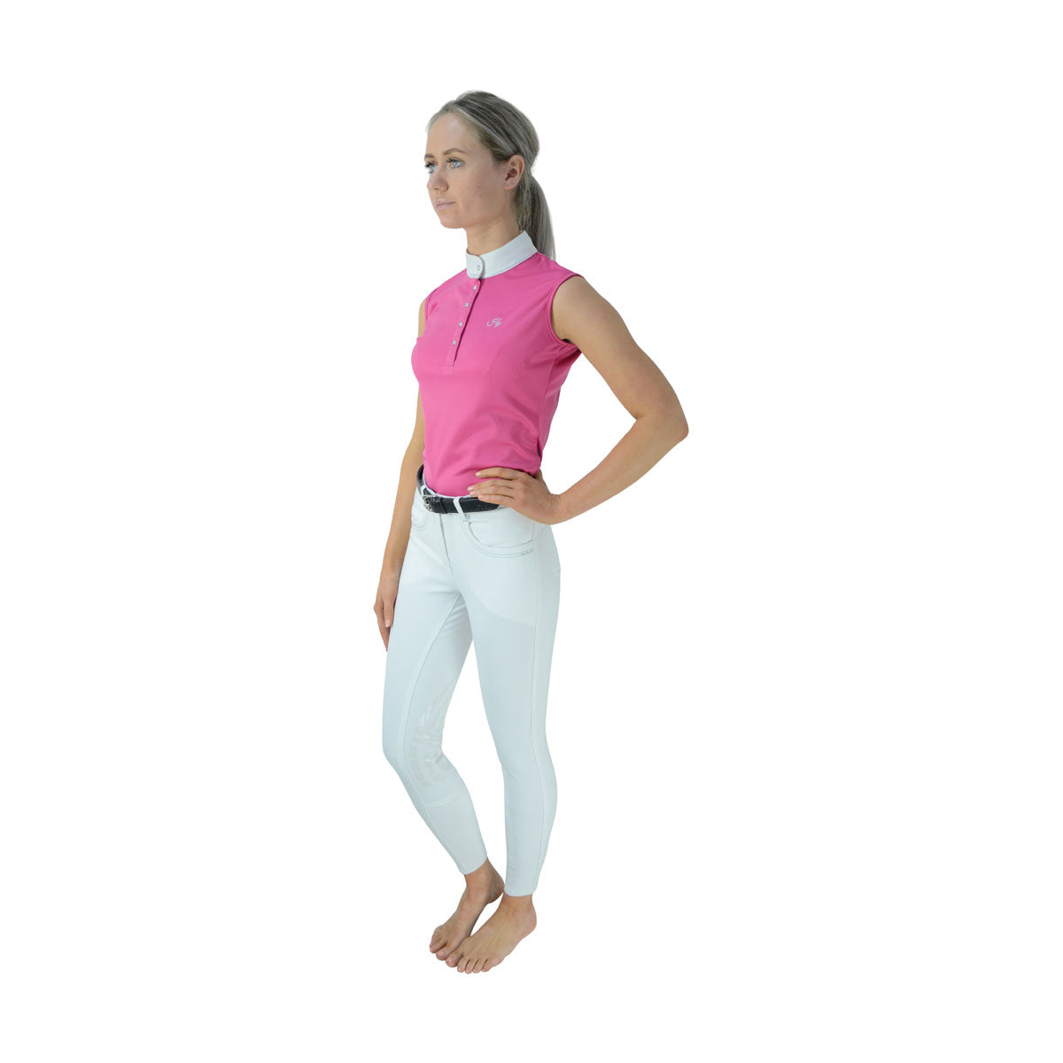 Cette chemise de concours sophistiquée est magnifiquement conçue avec cinq boutons-pression en cristal sur la patte de boutonnage et une couleur blanche contrastante avec des détails en soie. Fabriquée avec le tissu performant de pointe, Dri-tex, cette chemise sans manches respirante repousse l'humidité du corps pour un séchage rapide et un ajustement confortable. Le logo Hy est brodé en argent sur la poitrine pour une finition élégante.