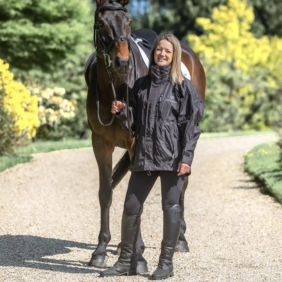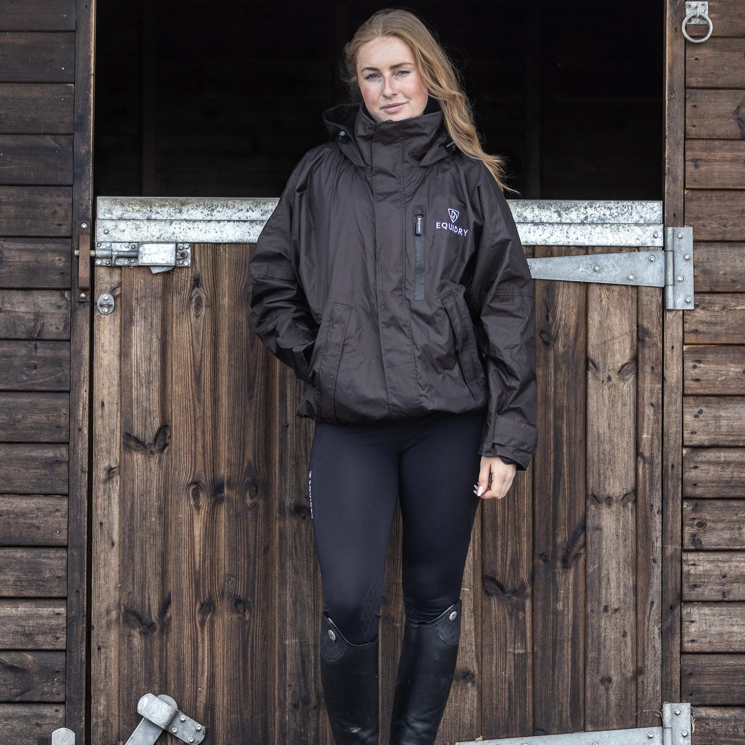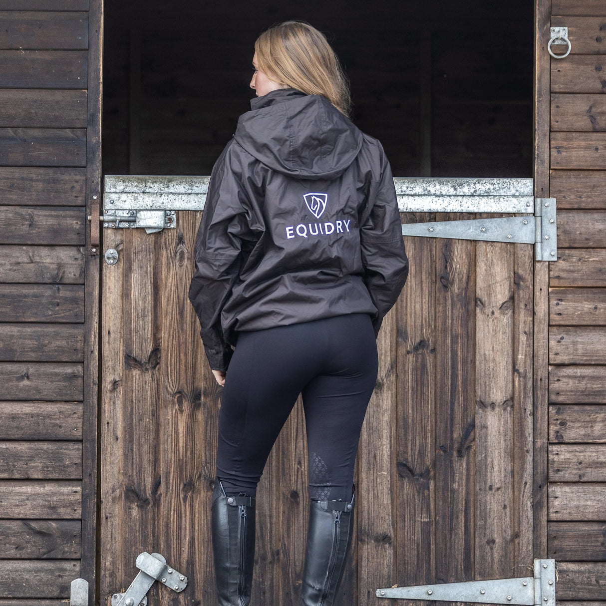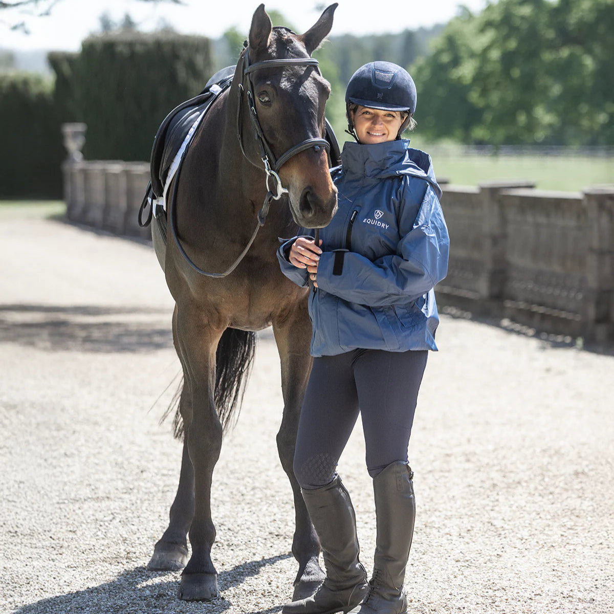 The EQUIDRY Shortie is a short, blouson-style jacket designed with advanced EQUIGUARD® technology, offering an impressive 20,000mm waterproof rating for outstanding protection against the elements. Its breathable mesh lining provides comfort in warmer weather while also allowing versatility for layering in colder conditions. The oversized, unisex fit ensures freedom of movement with ample room for additional layers or a body protector.