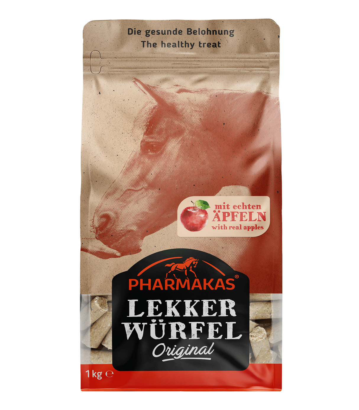 Pharmakas® Apple Treat Cubes are the healthy reward for increasing reciprocal trust between animal and human. They only contain real fruit, carefully selected ingredients of the highest quality, important vitamins and minerals as well as quality trace elements and a lot of fibre. A conscious decision was made to do without flavourings and colouring. Naturally, the treat cubes are free of animal raw materials. Pharmakas® treat cubes also encourage natural chewing. The elaborate production process ensures that the treat cubes remain crunchy and fresh and thus provide even more biting and chewing entertainment for horses. Horse lovers have been trusting this healthy reward for decades!