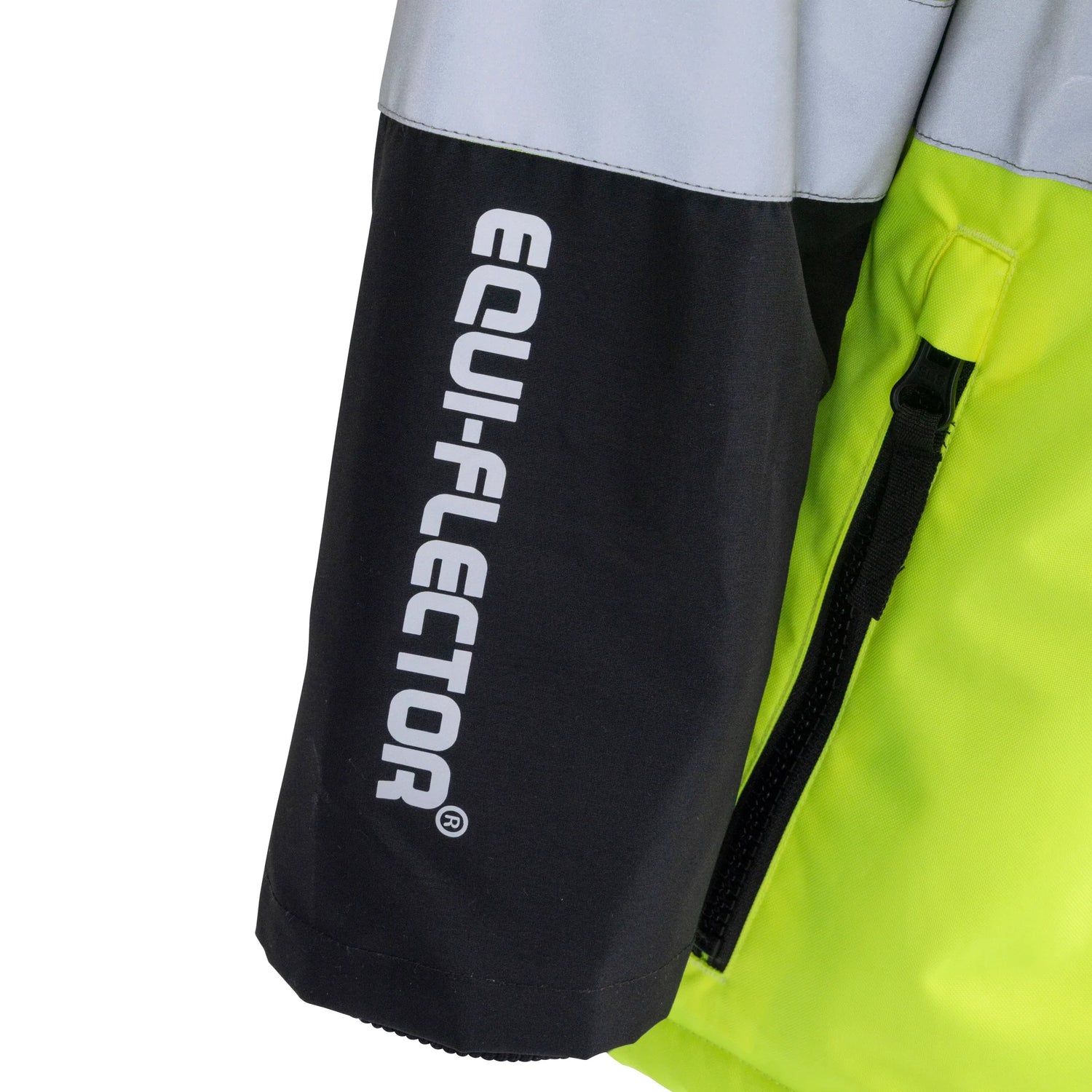 Keeping you visible in all light conditions, the EQUI-FLECTOR® jacket is the ideal cover up for the cold and wet, in or out of the saddle. Together with the bright colour, bold graphics are visible at distance, and 360° reflective prints offer visibility in darker conditions. The waterproof and breathable outer is hardwearing to resist wear and tear. Deep pile fleece lining to the jacket, hood and pockets provide cosy warmth. Valuables stay safe in one inner and two outer zip pockets. The lower half of the arm is left dark in colour to avoid soil marks. Rider enhanced benefits: hem opening zip, rear rider vents for seated comfort, in-saddle weather protection, a removable hood for rider preference. Available in adult and child sizes.