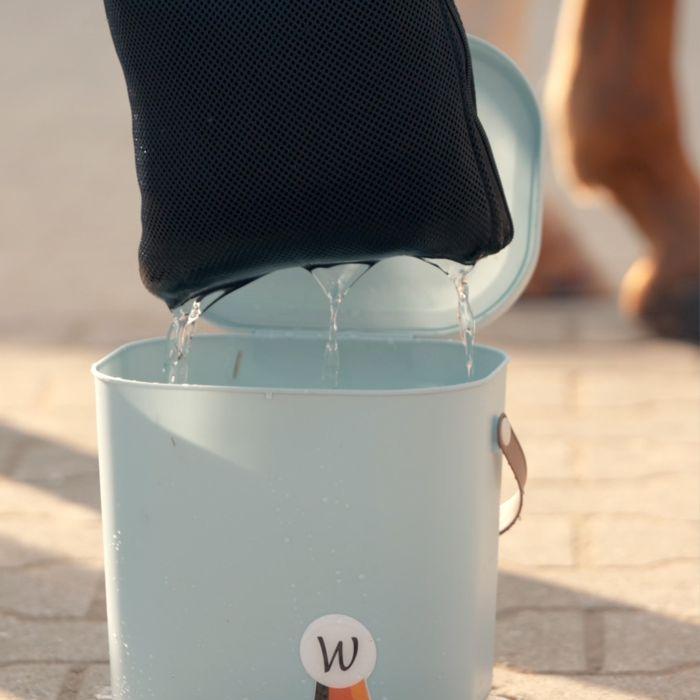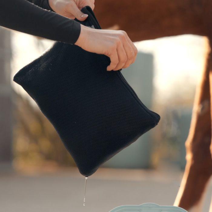 "The innovative W-health & care Ice layer cooling blanket is a perfect solution to cool down the horse on hot summer days. With the Ice layer cooling rug, water can be saved and the body temperature of the horse can be lowered evenly at the same time. The rug comes with a practical bag that can be dipped in a bucket of water along with the rug. Afterwards, wring out the rug so that it does not drip and lay it on the horse""s back. The blanket""s special materials ensure that the water gradually absorbs heat as it evaporates, resulting in a pleasant cooling effect. The rug is secured with a clip fastener at the chest. Please only place the blanket on the horse under supervision. Not suitable for walking, pasture or paddock."