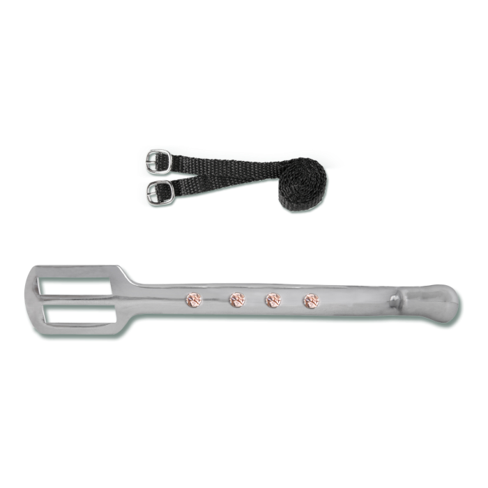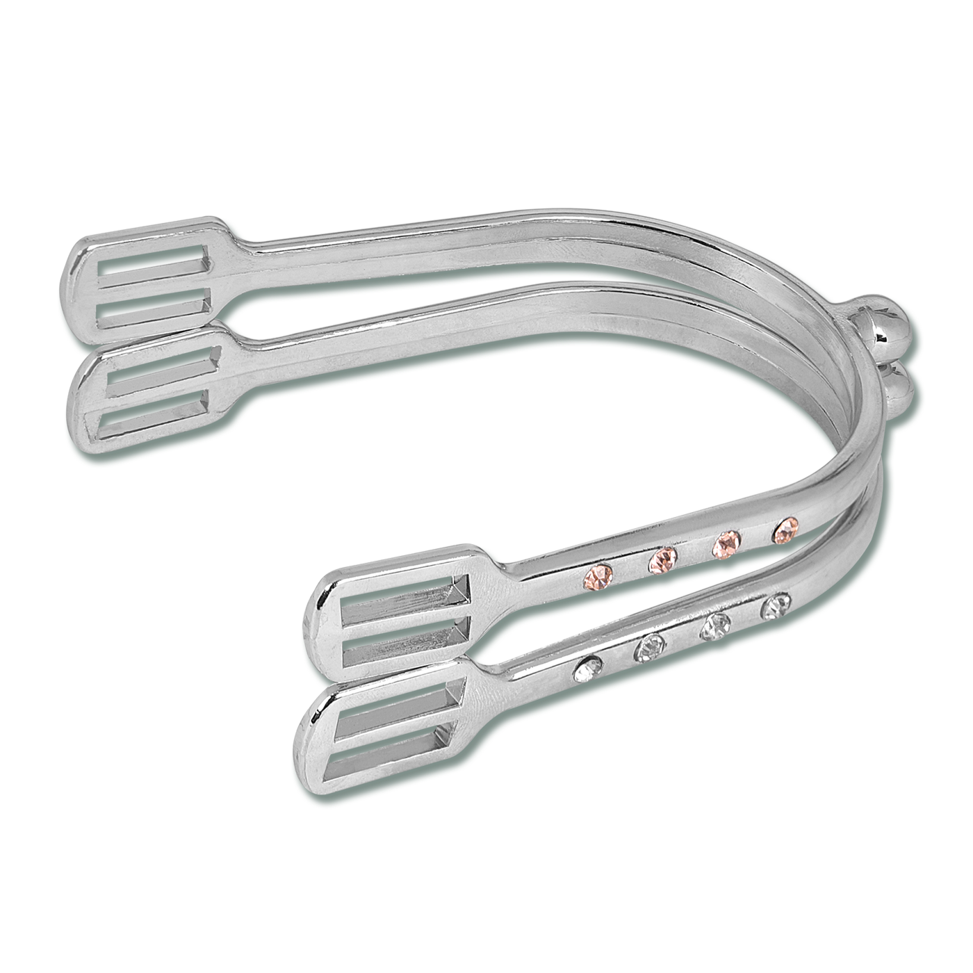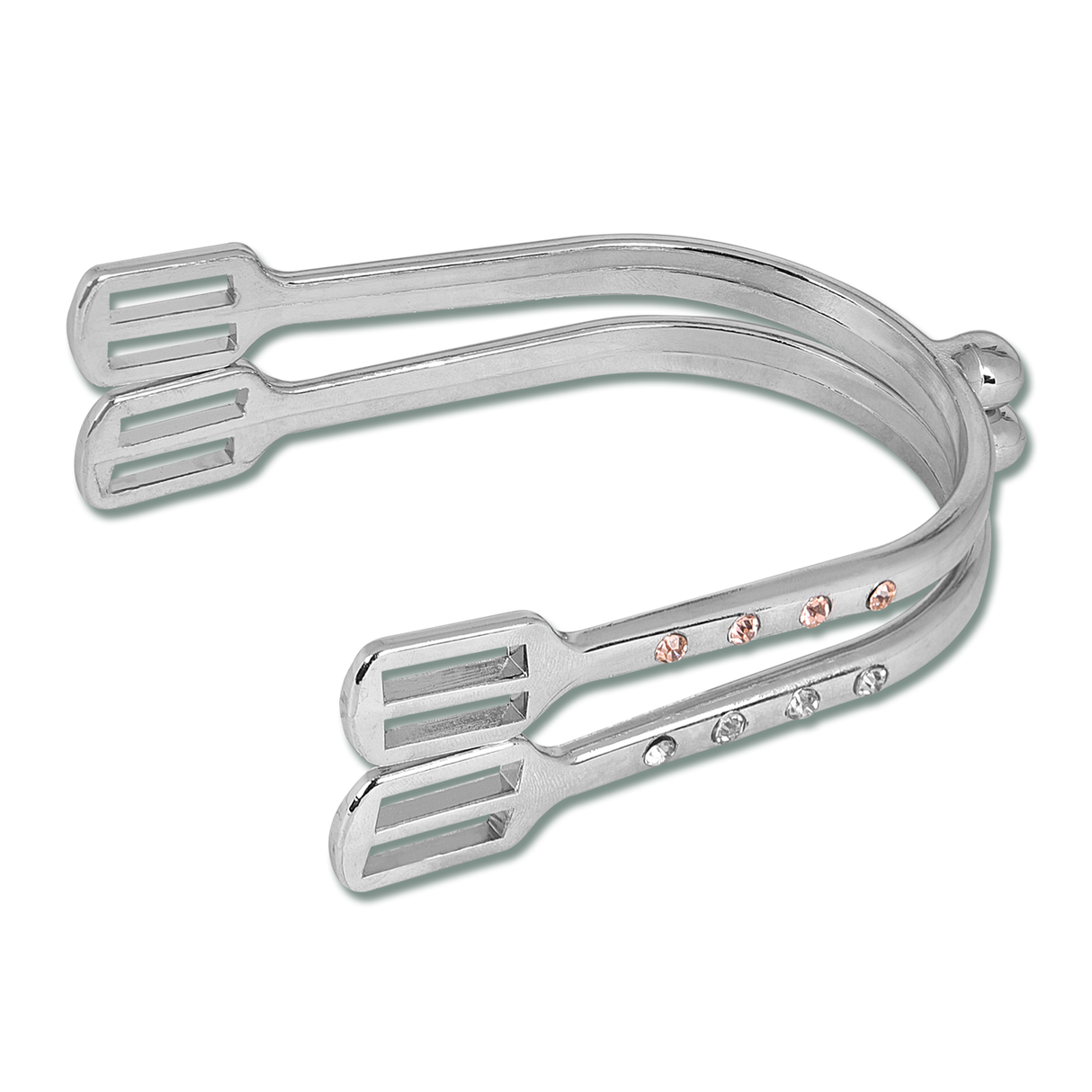 Spurs with shank, set with rhinestones on the outside. With perlon spur straps, rust-proof, pair.