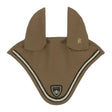 The Cavallo Lydia Fly Veil utilizes quick-drying, odor-neutral, and skin-friendly functional jersey material. Its head area is perforated, and the left ear features a printed Cavallo stirrup logo. The fly bonnet ears are framed by a black tape with a gold-color contrast.