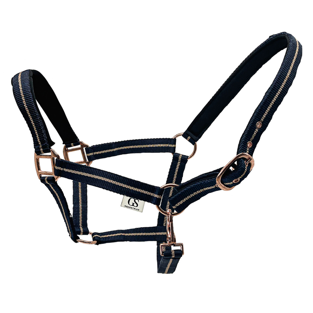 GS Equestrian Lurex Rose Gold Detail Headcollar - Navy/Rose Gold / Pony is backordered and will ship as soon as it is back in stock.