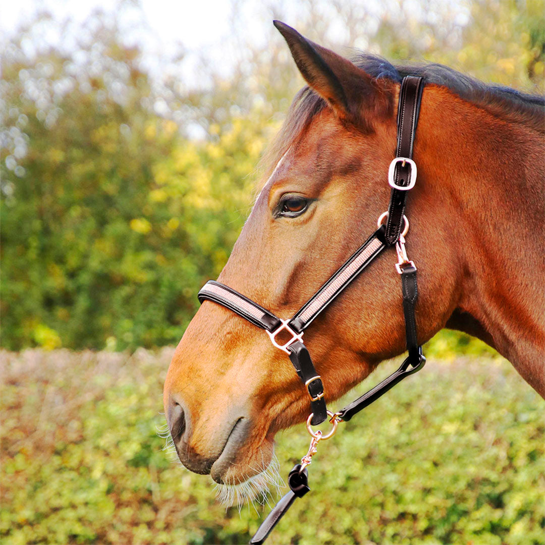 The Exquisite Hy Equestrian Rosciano Rose Gold Detail Leather Head Collar has been encrusted with delicate rose gold diamantes and is sure to make your horse stand out from the crowd whether you are using it every day around the yard or for best at competitions