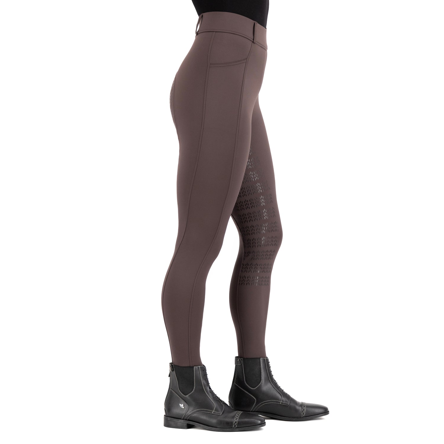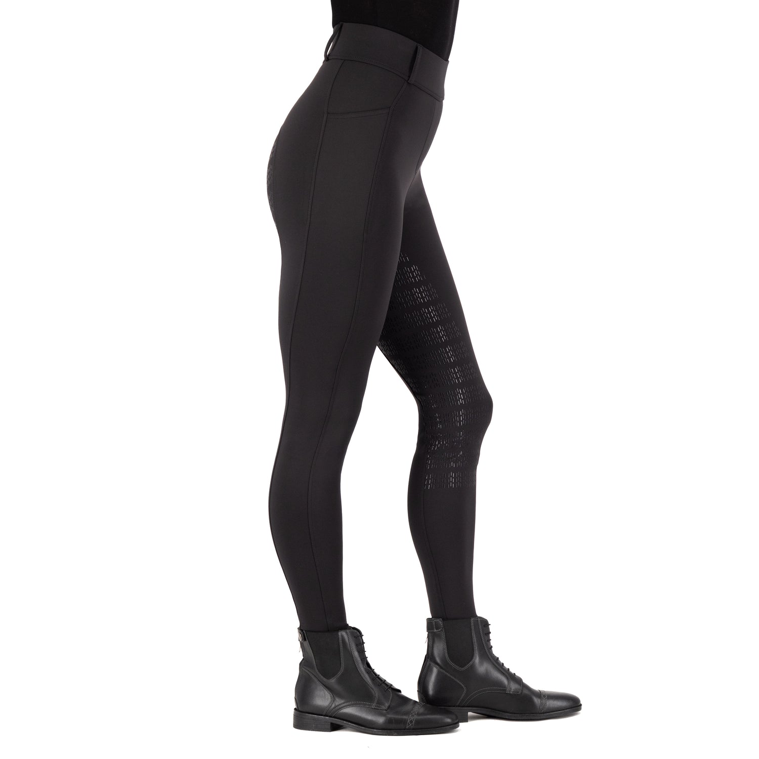 As an expert in horse riding gear, we present the Imperial Riding Tamara Full Grip Riding Tights. These all-year hybrid tights have a waistband with elastic and fabric covering for comfort. Equipped with belt loops, 1 phone pocket, and a branded metal badge, they offer both style and functionality. The silicon full seat and highly stretchable fabric provide optimal grip and movement.