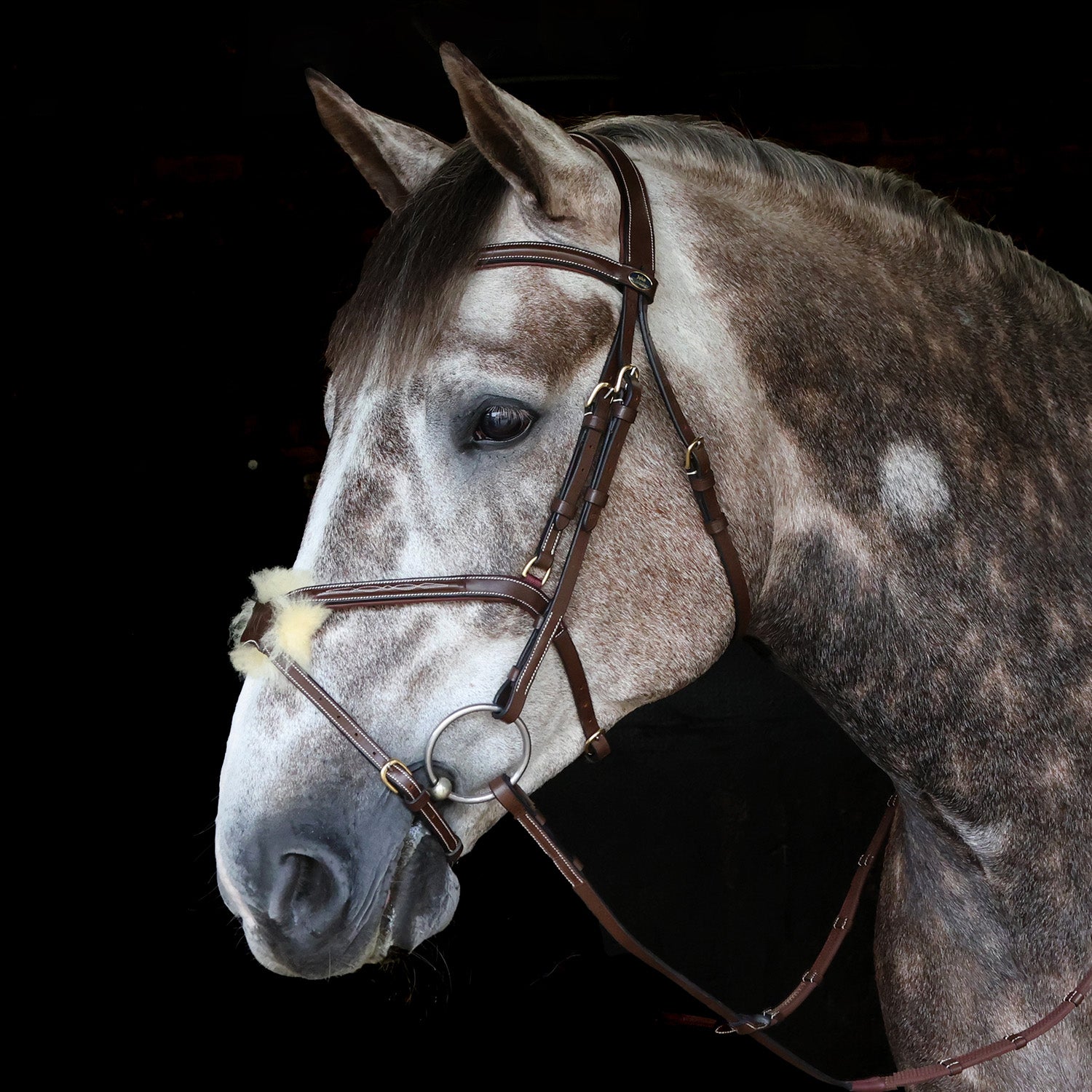 The figure 8 noseband of this bridle features a decorative stitch and subtle JW embossing on the noseband and features soft, sheepskin padding on the underside. Featuring a straight, padded headpiece, billet cheekpieces, a U-shaped browband with raised detailing and decorative stitch and solid brass hardware. Comes with billet 9-loop rubber reins.